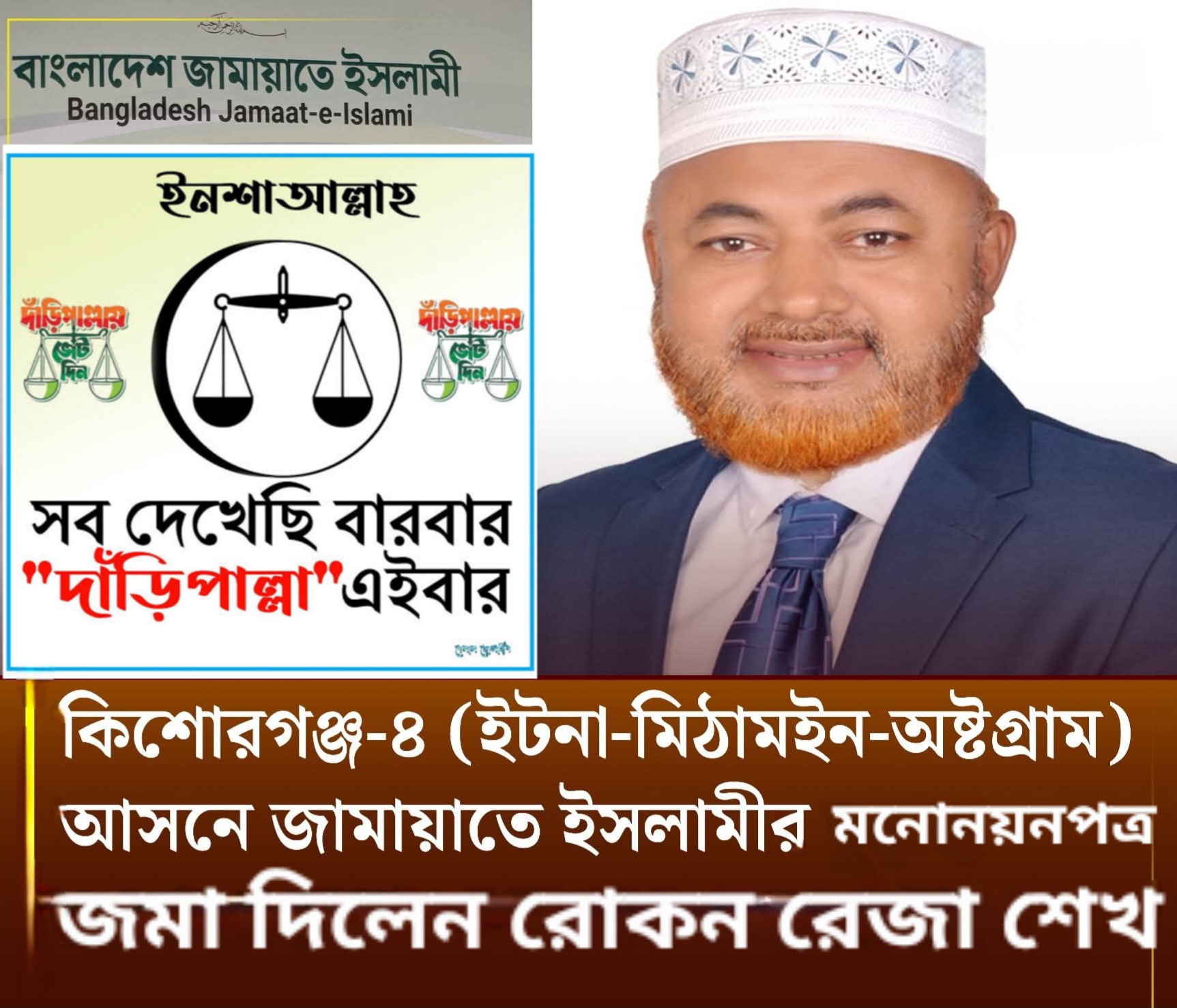 ত্রয়োদশ জাতীয় সংসদ নির্বাচনে অংশগ্রহণের জন্য কিশোরগঞ্জ-৪ (ইটনা-মিঠামইন-অষ্টগ্রাম) আসনে বাংলাদেশ জামায়াতে ইসলামীর মনোনীত প্রার্থী রোকন রেজা শেখ মনোনয়নপত্র জমা দিয়েছেন। সোমবার ২৯ ডিসেম্বর বিকেল ৪টায় কিশোরগঞ্জ জেলা রিটার্নিং অফিসার ও জেলা প্রশাসক মোহাম্মদ আসলাম মোল্লা এর কাছে তিনি মনোনয়নপত্র জমা দেন। এ সময় রোকন রেজা শেখ এর সাথে তার প্রধান নির্বাচনী এজেন্ট ও দলীয় নেতাকর্মীগণ উপস্থিত ছিলেন।