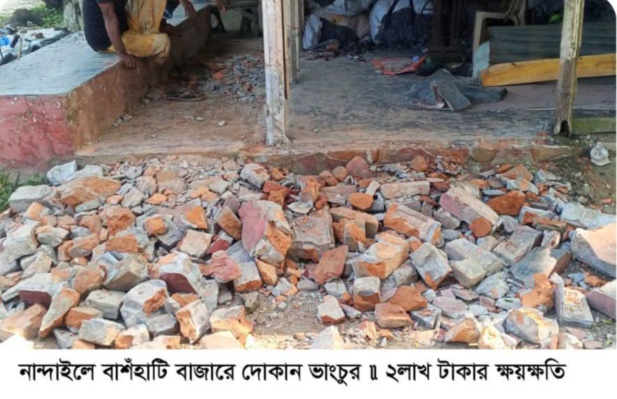 ময়মনসিংহের নান্দাইল উপজেলার চন্ডীপাশা ইউনিয়নের বাশঁহাটি বাজারে বৃহস্পতিবার (১৬ অক্টোবর) দুপুরে বাশঁহাটি গ্রামের মৃত নাজিম উদ্দিন মাস্টারের দুইপুত্র মোঃ মোখলেছুর রহমান ও নূরে আলমের মালিকানাধীন আধাপাকা দোকান ঘরে প্রতিপক্ষ মহিলা সহ হামলা চালিয়ে দোকান ঘরের পাকা দেওয়াল ভাংচুর সহ দোকানে হামলা চালিয়ে ২ লাখ টাকার মালামালের ক্ষতি সহ নগদ টাকা লুটপাট করে নিয়ে যায়। হামলার খবর পেয়ে নান্দাইল মডেল থানা পুলিশ ঘটনাস্থলে উপস্থিত হয়ে পরিস্থিতি নিয়ন্ত্রন করে। দোকান মালিক মোখলেছুর রহমান ও নূরে আলম জানান, স্থানীয় আওয়ামীলীগের ২জন প্রভাবশালী নেতার ইন্ধনে প্রতিপক্ষ তাড়াইল উপজেলার পুরুড়া গ্রামের বজলুর রহমান ভূইঁয়ার পুত্র চঞ্চল মিয়া, নান্দাইল উপজেলার চারাআনিপাড়া গ্রামের আবদুর রহিমের পুত্র শফিকুর রহমান জীবনের প্রকাশ্যে নেতৃত্বে অজ্ঞাত ১০/১২জন মহিলা সহ প্রকাশ্যে দিবালোকে দোকানে হামলা চালায়। তারা শাবল দিয়ে দোকানের দেওয়াল ভেঙ্গে ফেলে। এসময় প্রতিপক্ষরা দোকানে ব্যাপক ভাংচুর ও লুটপাট করে ২ লাখ টাকার ক্ষয়ক্ষতি সাধন করেছে। পরে ২ পক্ষের মাঝে ধাওয়া পাল্টা ধাওয়া শুরু হলে খবর পেয়ে পুলিশ দ্রুত ঘটনাস্থলে পৌছে পরিস্থিতি নিয়ন্ত্রন করে। পুলিশের উপস্থিতি দেখে হামলাকারীরা পালিয়ে যায়। দোকান মালিক মোখলেছুর রহমান ও নূরে আলম জানান, প্রতিপক্ষের সাথে জায়গা জমি নিয়ে পূর্বেও তারা দোকানে হামলা করেছিল। নান্দাইল মডেল থানার অফিসার ইনচার্জ খন্দকার জালাল উদ্দিন মাহমুদ জানান, দোকান পাটে হামলার সংবাদ পাওয়ার সাথে সাথে তিনি ঘটনাস্থলে পুলিশ পাঠিয়ে পরিস্থিতি নিয়ন্ত্রন করেন। বাদীর লিখিত অভিযোগ পাওয়ার পর আইনগত ব্যবস্থা গ্রহন করা হবে। প্রকাশ্যে সন্ত্রাসী কায়দায় দোকান পাটে হামলার ঘটনায় বাজারের অন্যান্য ব্যবসায়ীদের মাঝে চরম আতংক বিরাজ করছে